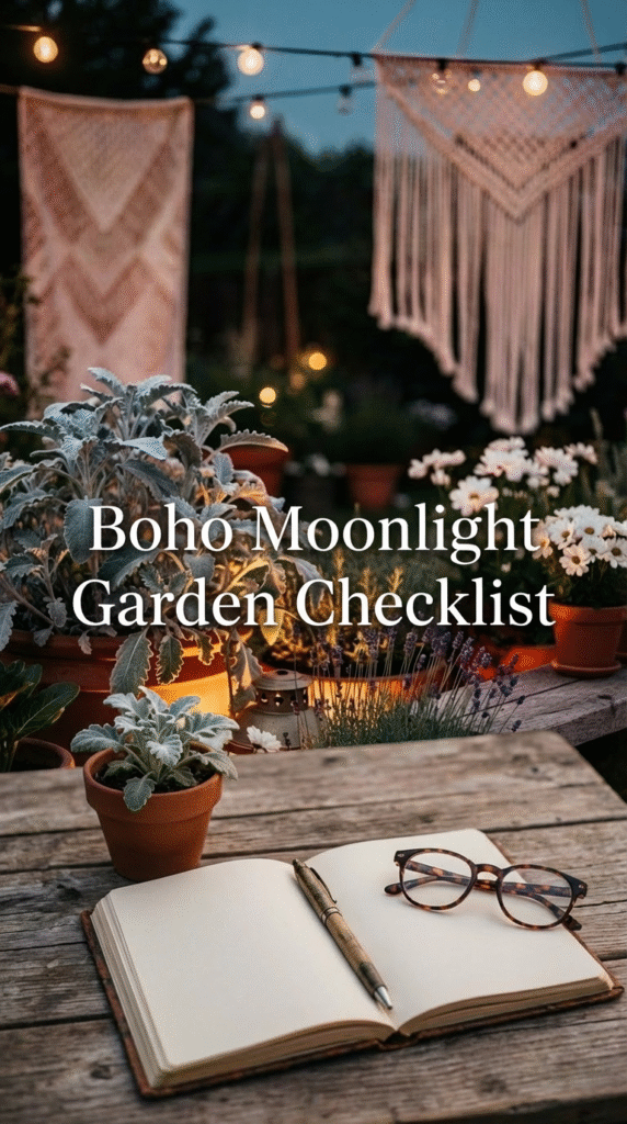 This quick checklist pulls together the main pieces of a cozy boho moonlight garden so planning feels easier and less overwhelming. It can be used as a shopping list, a weekend project guide, or a gentle roadmap for the next season.