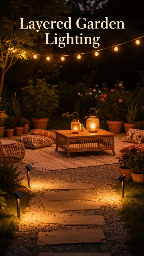 Lighting is what turns a regular backyard into a true moonlight garden. This section focuses on creating soft, layered light that feels flattering, safe to walk through, and easy on tired evening eyes. Instead of one bright spotlight, think in gentle layers: overhead glow, eye level sparkle, and low lighting along the ground.