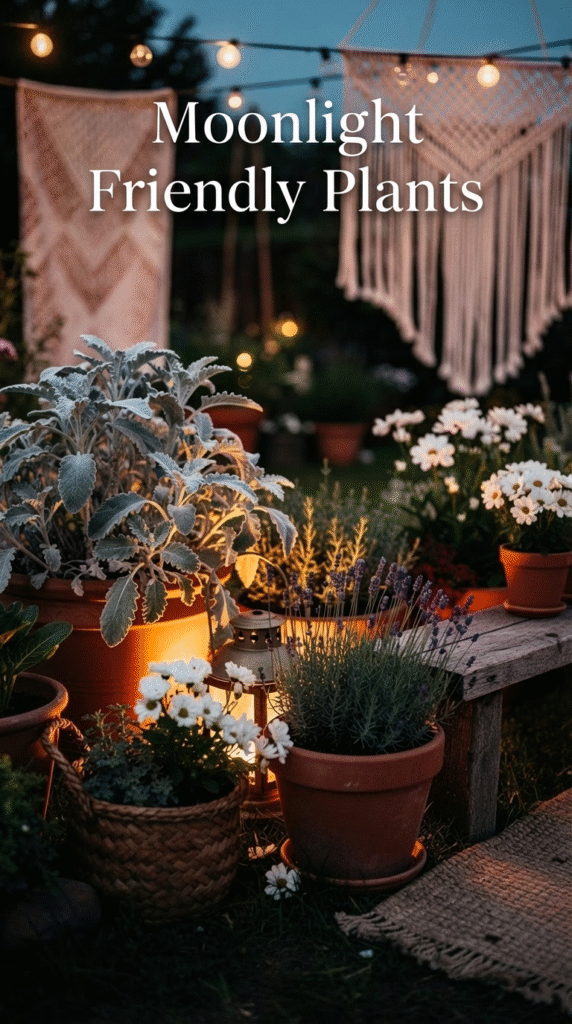 Plants are what give a boho moonlight garden its dreamy, slightly wild feeling. This section focuses on simple, low stress choices that look good in the dark, tolerate a bit of neglect, and work in containers or beds so almost any space can get that soft, glowy look. Think pale blooms, silvery foliage, and a little evening fragrance rather than fussy, high maintenance flowerbeds.