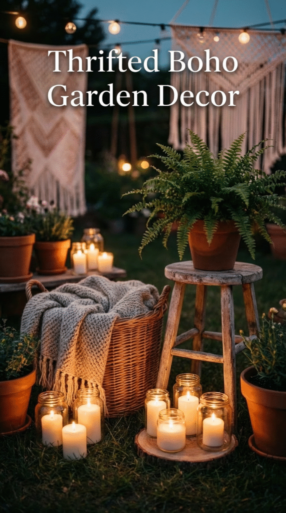 Thrifted decor is where a moonlight garden starts to feel personal and a little magical. This section focuses on simple, secondhand finds that can handle outdoor life and add that collected, boho feeling without a big decor budget. Think baskets, jars, pottery, and small tables that look even better with a little wear.
